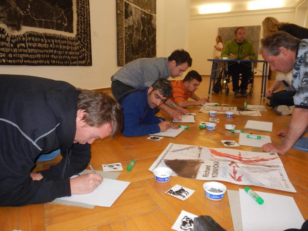 Do Litoměřic jsme se dopravili společně autobusem a prošli náměstím až do našeho cíle. V galerii nás přivítala naše praktikantka slečna Tereza, která nás výstavou provázela. Výstava byla opravdu zajímavá, hlavně tím, že umělec své obrazy maloval pouze ohněm. Tereza nám o všech dílech hezky vyprávěla, např. za jaké situace obraz vznikal a jaké techniky umělec použil. Někdy to bylo malování pájkou a někdy také rozžhavenou špejlí či jehlou. Naši klienti měli možnost si dokonce jednu z technik vyzkoušet, když pomocí lepidla a popela malovali na papír své znamení zvěrokruhu. Všem se to moc líbilo a obrázky jsme si vystavili na naší nástěnce.