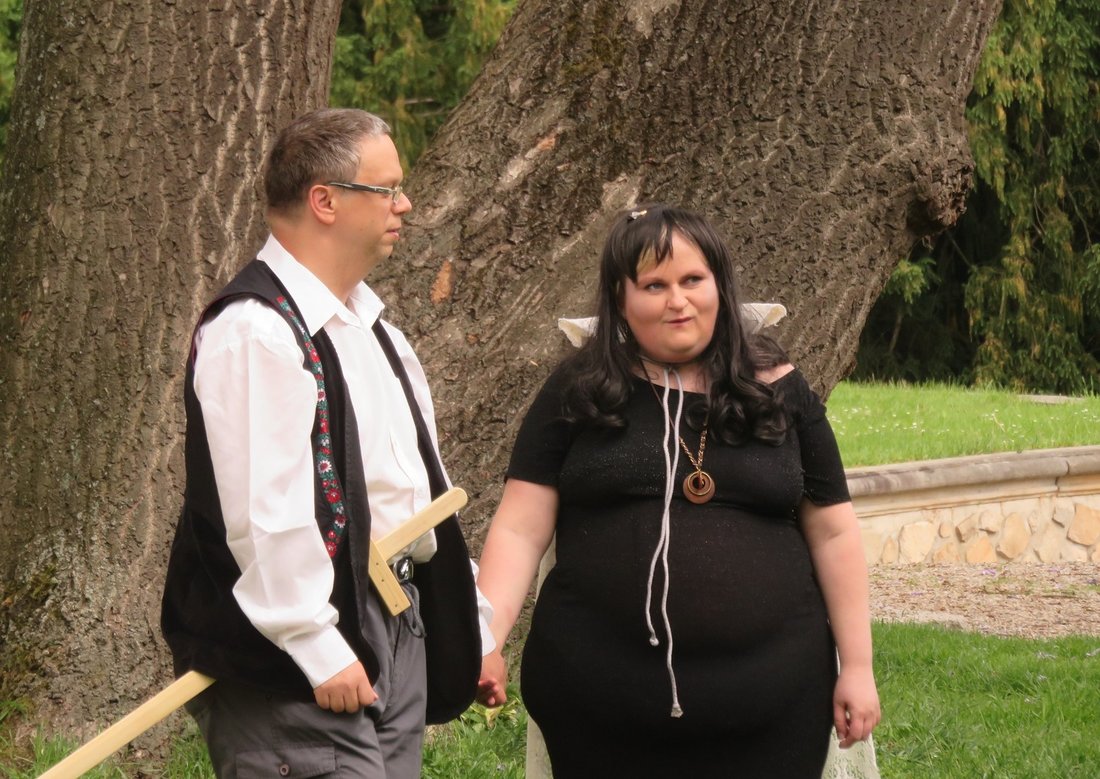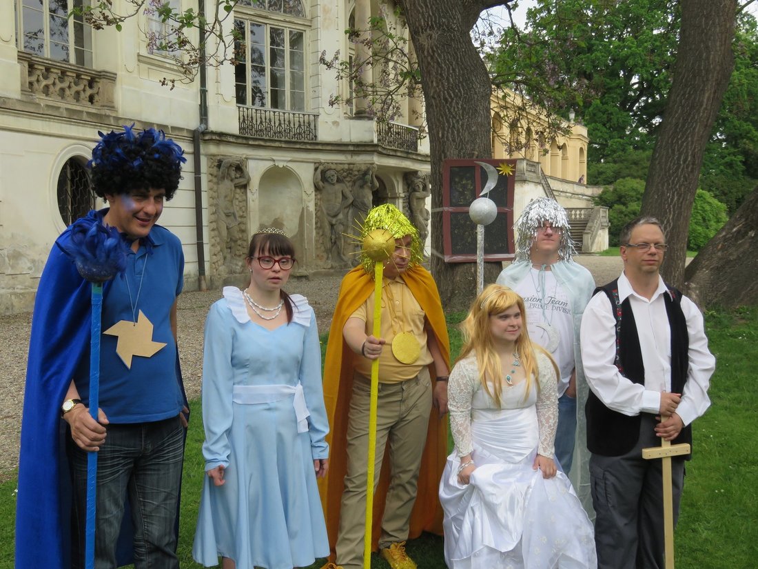 Tuto pohádku jsme vybrali právě proto, že se natáčela na zámku v Ploskovicích. Jako kulisy ke hraní jsme využili zámecký park, schody a krásný vzrostlý strom. Za slunečného počasí, křiku pávů a našeho nadšení začalo dlouho očekávané představení. Troufáme si říci, že mělo úspěch a díky velkému zájmu pracovníků mělo za pár dní na stejném místě reprízu. Po skončení divadla jsme příjemné odpoledne zakončili posezením u kávy a zákusků v zámecké kavárně. Byl to moc povedený den. Děkujeme všem za pomoc s přípravou.