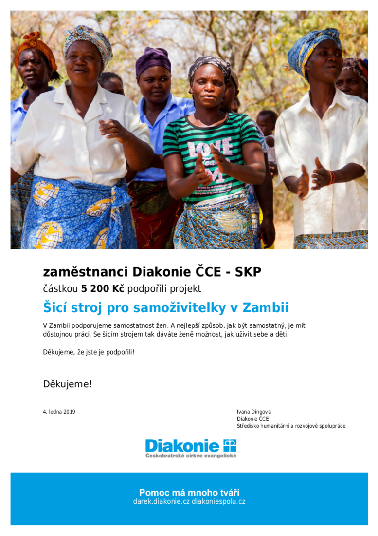I letos tomu nebylo jinak. Zaměstnanci se rozhodovali mezi 5 projekty. Velkou většinu získal projekt na podporu žen v Zambii, a tak vybraná částka 5 200 Kč poputuje na nákup šicích strojů, které ženám zajistí samostatnou a důstojnou práci. Více informací o projektech Střediska humanitární a rozvojové spolupráce si můžete přečíst na www.diakoniespolu.cz/darekna3/.