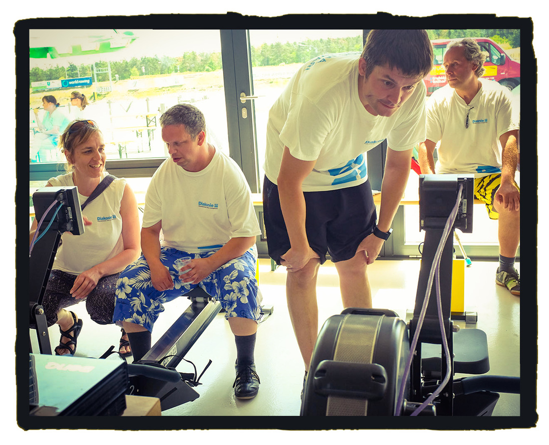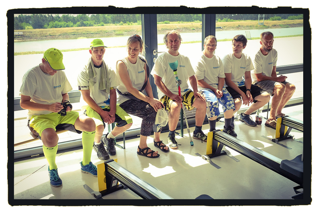 Veslování na 1000 m: Eda 1. místo, Martin 3. místo, Vlasta 10. místo, Michal 12. místo, Broňa 14. místo, Vašek 17. místo.
